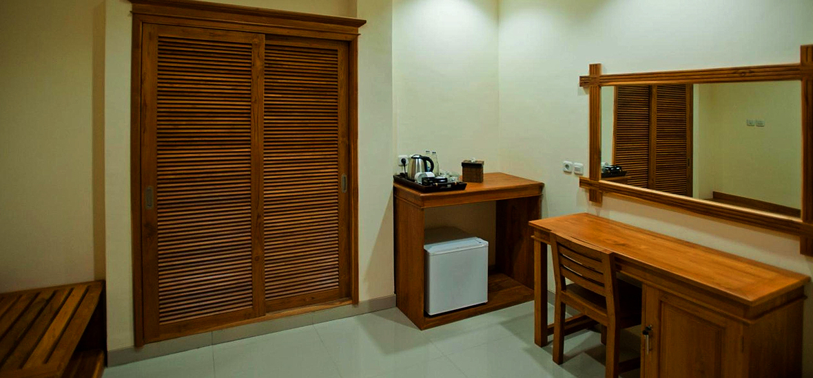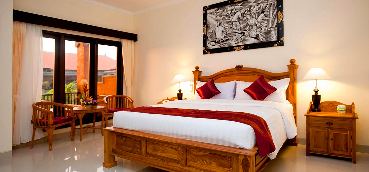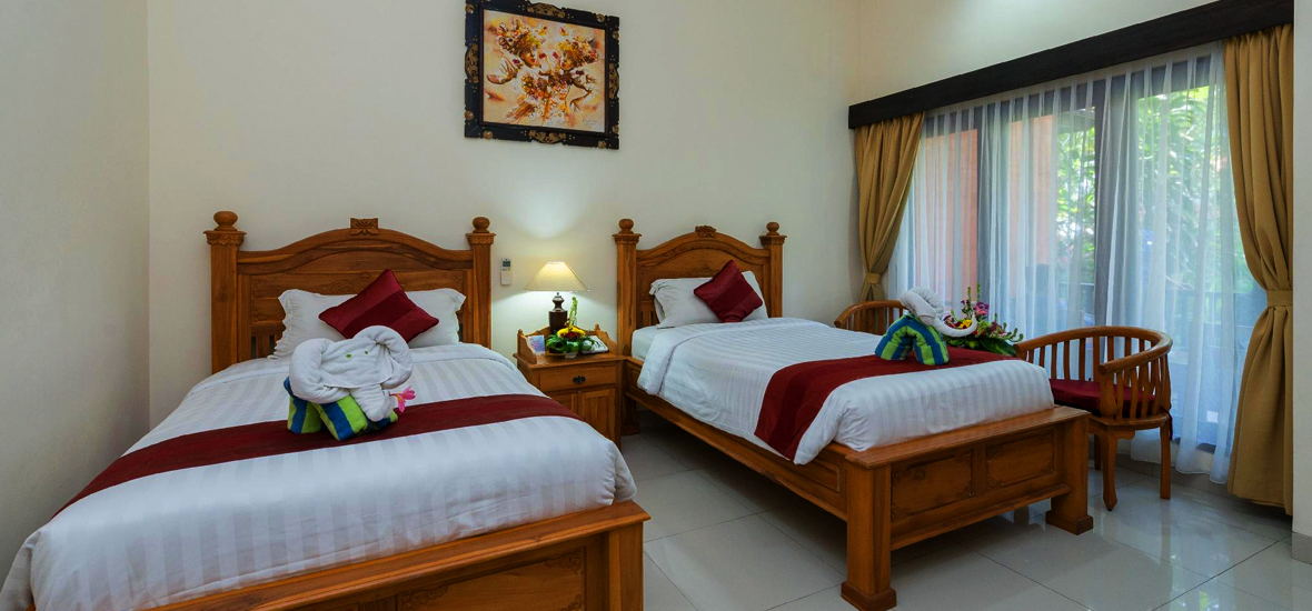 Deluxe Room at Swastika Bungalows offers a spacious bedroom with 45 square meter in size and consists of one doubel size bed or two single bed base on guest preference, acccomodate 2 adult plus 1 chidlren and a balcony/terrace with pool view. This rooms has a private bathroom with shower and bathub facilities, electric kettle and free WiFi!