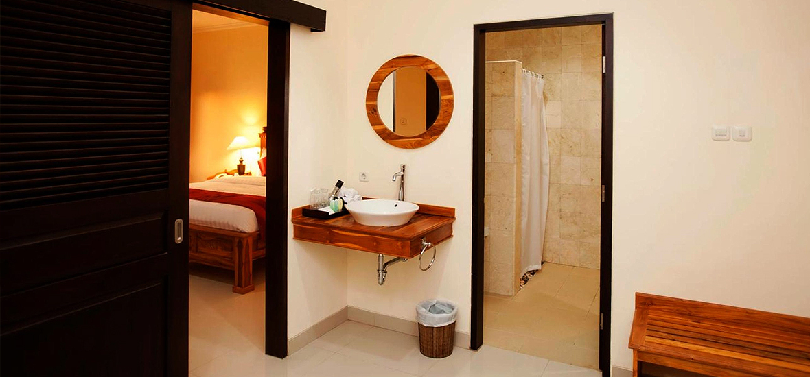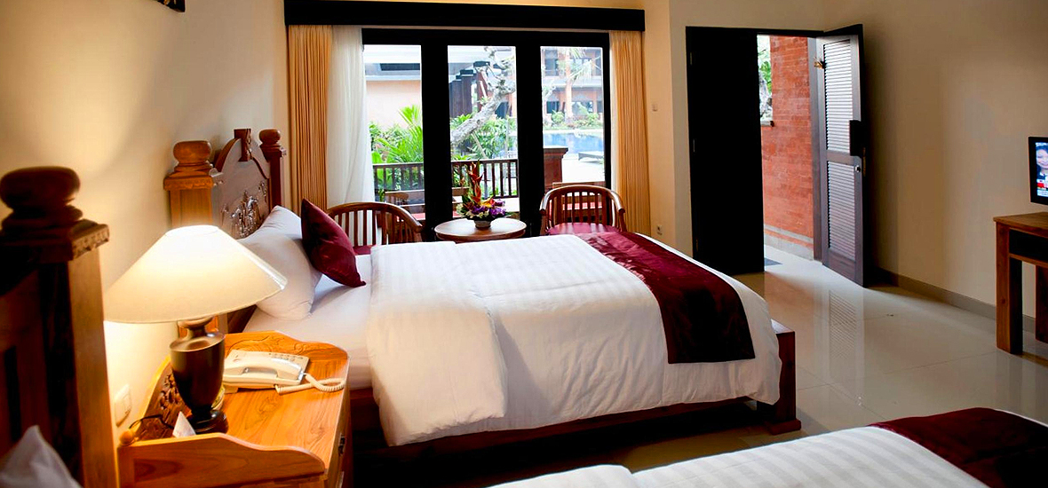 Deluxe Room at Swastika Bungalows offers a spacious bedroom with 45 square meter in size and consists of one doubel size bed or two single bed base on guest preference, acccomodate 2 adult plus 1 chidlren and a balcony/terrace with pool view. This rooms has a private bathroom with shower and bathub facilities, electric kettle and free WiFi!