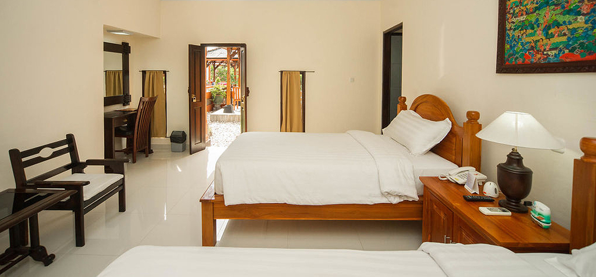 Accommodate for two adult plus one children. Bathtub or shower facilities are included in an private bathroom.
